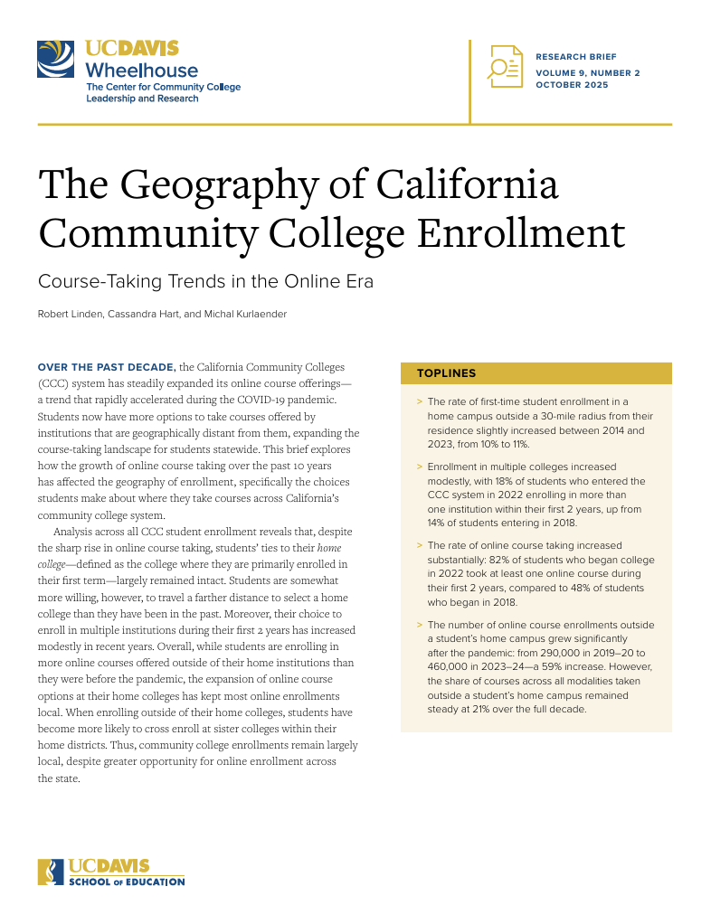 This brief addresses the impact of attempting credits in distance education modalities on student academic outcomes and how these effects vary by the number of credits attempted and across student populations in Los Angeles Community College District.