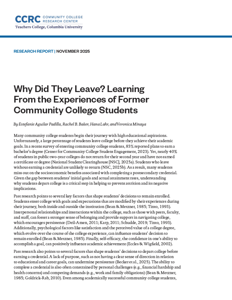 Based on survey findings from 480 former students who stopped out of community college before the start of their second year, this report sheds light on the experiences of this population and their reasons for leaving college.